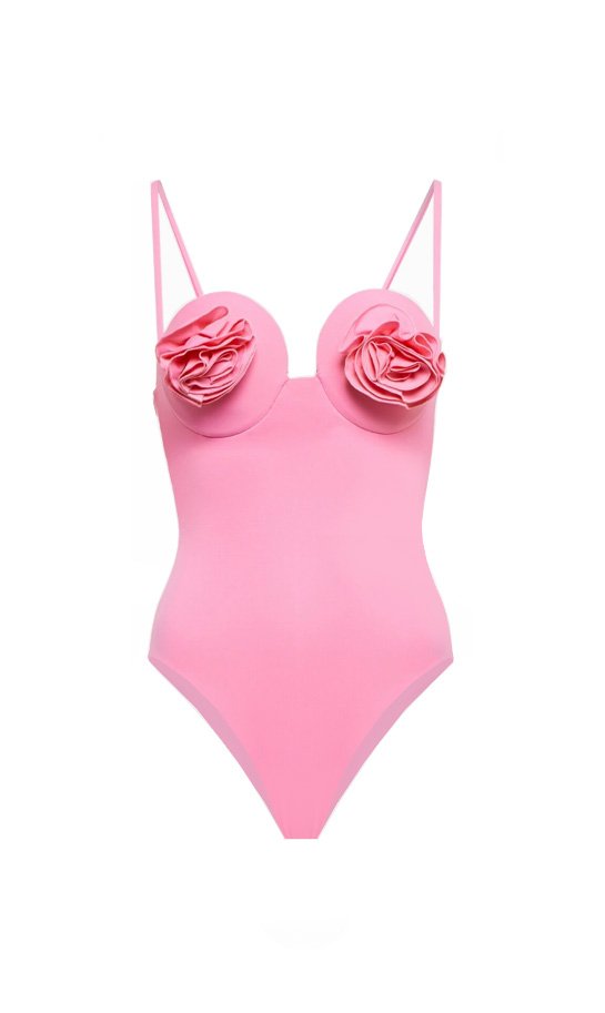 Traje de baño entero en tono rosa con copas estructuradas y aplicación floral en relieve que aporta un toque romántico y sexy, sus tirantes delgados y su corte high-cut crean una silueta estilizada.