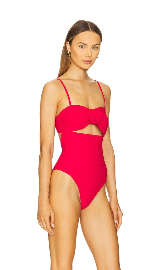 Traje de baño de una pieza con detalle de rosa central. Su diseño realza la silueta con un sutil cut-out bajo el busto, mientras la rosa aporta un toque romántico y sofisticado. Ideal para un look femenino y protagonista bajo el sol.